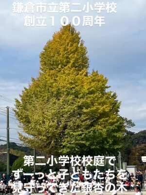 100年目を迎え、そう言えば、校門を入ってすぐに聳え立つ銀杏の木はいつからあるのでしょうか?少なくとも、私が第二小学校に一年生で入学した時からあります。運動会など工程での行事の際は、必ずこの銀杏の木が集合、出発、解散の基点の役割を果たしてきており、何かにつけて~銀杏の木の下・・・・~が伝統となってきました。そういう訳で、ずーっと代々子ども達を見守ってきてくれている銀杏の木なのです。来賓席からみる反対側にある銀杏をつくづくと眺めて、銀杏の木に感謝しました。実際に、100歳だったら素敵です。