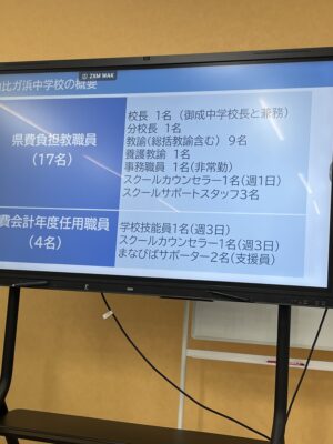 そして、その後、由比ヶ浜中学校へ。分校長の岩田明先生から、現在在校生31名の新しく10校目にできた中学校についての説明を熱い語りで伺いました。