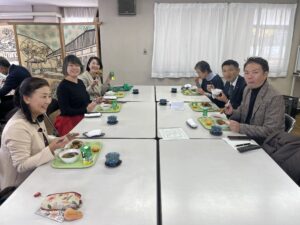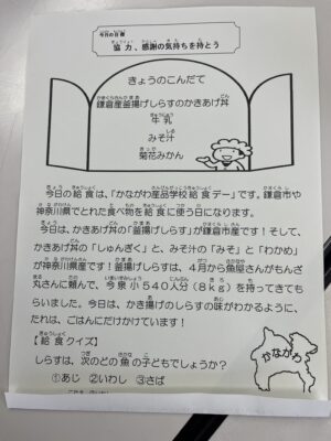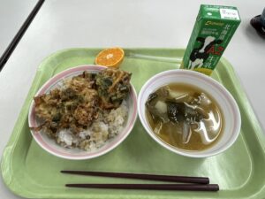 まずは、今泉小学校の給食を頂き、地産地消にこだわったシラスを使ったかき揚げ天ぷらとワカメの味噌汁で美味しく頂きました。新人議員さん達には、鎌倉の地産地消についての説明をしました。