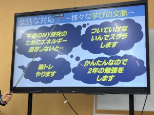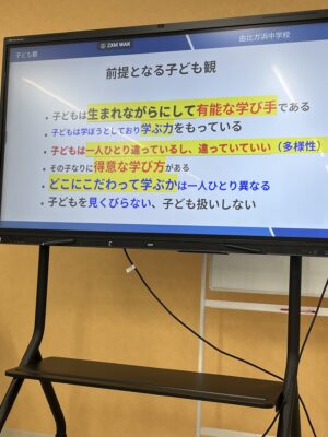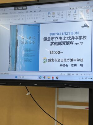 そして、その後、由比ヶ浜中学校へ。分校長の岩田明先生から、現在在校生31名の新しく10校目にできた中学校についての説明を熱い語りで伺いました。
