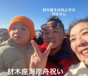 漁師さんが、陸に上がった自分の船からミカンやお菓子、お金を船から撒いて、祝います。