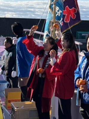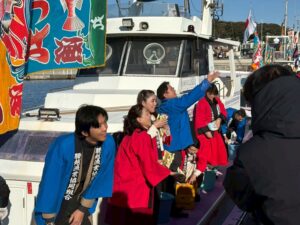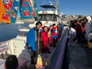 護岸に付けられた漁船からミカンやお菓子を集まった皆さんに撒くお手伝いをさせて頂きました。
